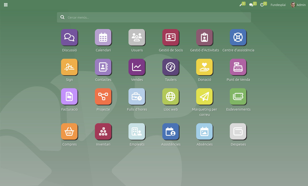Encontrarás todas las aplicaciones que te permitirán gestionar tu entidad: Gestión de socios, Contabilidad, Facturación, Registro horario, etc.
